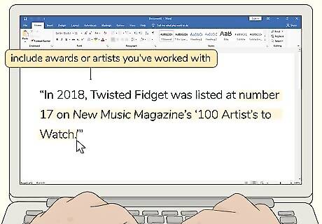 Include awards or artists you’ve worked with so long as they’re notable. If your band has opened for a famous rock star or was given some kind of award, including this lends some legitimacy to your band. This is also a good thing to include if you’re trying to provoke music writers or record labels to pay attention to you since it establishes that your band has something going for it. As an example, you may write, “Twisted Fidget has opened for Alanis Morrissett, Fiona Apple, and even toured with Katy Perry as her backing band.” Alternatively, you may say, “In 2018, Twisted Fidget was listed at number 17 on New Music Magazine’s ‘100 Artist’s to Watch.’” Stay away from mentioning accolades that aren’t going to be relevant to the average reader. If you band won your high school’s Battle of the Bands 10 years ago, it isn’t worth mentioning.