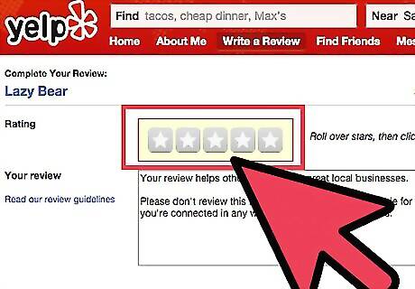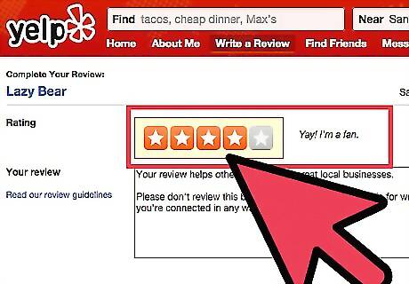 Understand the star ratings. To help you out, as you hover over the rating box, there will be several words that will help you explain your rating. Click the star-rating you believe should best match the conditions of your upcoming review. The ratings are as follows: 1-star: Eek! Methinks not! 2-star: Meh! I've experienced better. 3-star: A-Ok. 4-star: Yay! I'm a fan. 5-star: Woohoo! As good as it gets!