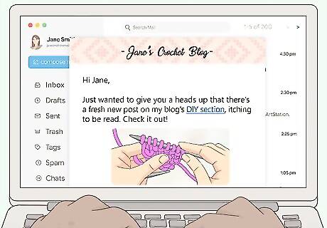 Share new blog posts on social media. Share your posts on Facebook, Twitter, Instagram, and any other social media sites you frequent. This will help to alert people when you have a new blog post and it may also help you to gain new readers. Use hashtags to help expand the reach of your posts. For example, if share a pattern for a mermaid tail blanket, you might use hashtags like #mermaidtailblanket and #crochetmermaidtail. Check to see what other bloggers have used when they posted their patterns if you’re not sure what hashtags to use.