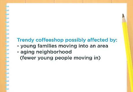 Identify market trends. Markets rarely stand still. You should note any changes that you see. What are the changes in demographics, taste, or customer needs? Are certain products or services gaining traction. For example, young families might be moving into an area. By contrast, a neighbor may be aging as few young people move to it. These trends can affect the success of your business.