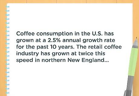 Analyze the industry. Offer a birds-eye view of your industry. How fast has the market grown? What is its current size? Provide national and local information. Give the reader some sense of whether this is an emerging market or one that is established. For example, an analysis of the coffee industry might begin, “Coffee consumption in the U.S. has grown at a 2.5% annual growth rate for the past 10 years. The retail coffee industry has grown at twice this speed in northern New England….”