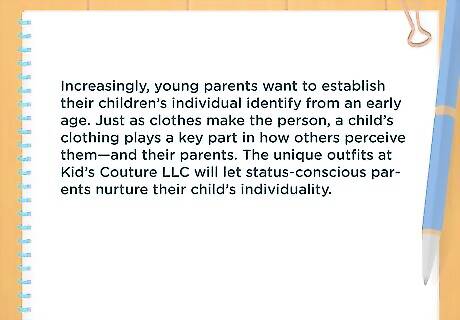 Explain what market need you satisfy. Your products or services should meet a consumer need. For example, a children’s clothing boutique meets the needs of parents who want to dress their children in unique outfits. Sometimes, a need only arises after you’ve created your business. However, it will be difficult to get investors in this situation. For example, you might describe the need for children’s clothing this way: “Increasingly, young parents want to establish their children’s individual identify from an early age. Just as clothes make the person, a child’s clothing plays a key part in how others perceive them—and their parents. The unique outfits at Kid’s Couture LLC will let status-conscious parents nurture their child’s individuality.”