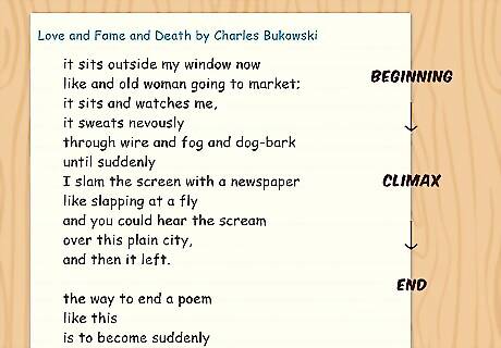 Tell a story with a beginning, climax, and end. Your poem won't be as developed as a short story, but it should have the basic elements of a story. You may only suggest story elements and hint at what’s happening. This will help you convey to the audience what you’re trying to say. The climax of your poem will pack the biggest emotional punch. It should bring home for the audience what you’re trying to say. For example, a poem about ending the relationship may start with a description of the nights spent together. Then it might illustrate troubles in the relationship, climaxing at the moment you broke up. You might then include details of nights after the breakup, concluding with your acceptance of the end.