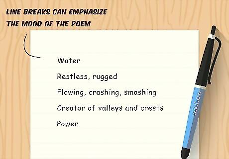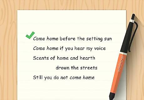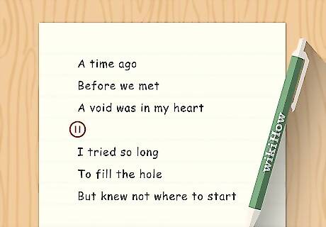Create line breaks where you naturally pause. Reading aloud can help you determine the best place for line breaks. What looks good on paper might not have the best rhythm when spoken aloud. Your line breaks will create emphasis and help you establish a rhythm as you perform the poem. Look for spots where you naturally stop to take a breath. Break your lines where you want to create impact. You can end on that word and allow it to linger for a moment. Use line breaks to create emphasis, such as to isolate an important word.