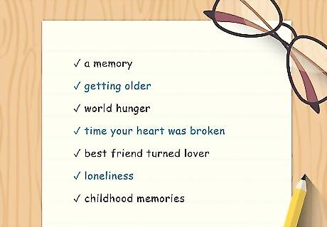 Write down issues, events, people, or ideas you’re passionate about. You can write about anything, but it helps to choose something that’s close to your heart. Choose a topic that you have a lot to say about. It might help to watch other performance poets either online or in person to get a feel for the topics people choose. Consider ways that you identify yourself, such as gender, sexuality, race, favorite hobbies, your passions, or other labels you give yourself. Think about the issues you care about, such as animal rights, ending poverty, or supporting those with mental illness. Write about the special people in your life, such as your first love, your mentor, a sibling who’s always there for you, an absentee parent, a parent who gave everything for you to succeed, etc. Express ideas that interest you, such as falling in love, rebirth, acceptance, starting a new chapter, etc.