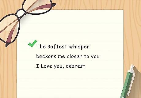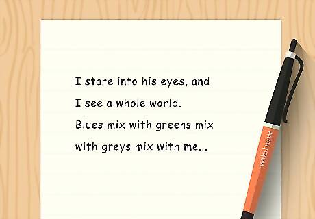 Use metaphor to create imagery in your poem. A metaphor compares two seemingly unlike things, which allows you to draw connections for the listener. Metaphors allow you to paint a picture with words that conveys how you feel about the subject matter. For example, you could compare falling in love to birth: "At your call/I emerged from the womb/Reborn/Torn from a cocoon of self protection/Thrust into your arms"