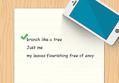 Incorporate rhyme to improve flow or draw attention. Rhymes aren’t just for the ends of lines. You can use rhyme inside your lines, as well. In fact, placing rhymes at the beginning or middle of lines can create more flow. You may also want to pair several rhyming words together to improve the sound of the poem or create emphasis. For example, you could create internal rhyme: "Alone I learned to live without/My doubts always on display/My heart a sleeve for the ripping" Repeating your rhyme can create emphasis, such as here: "I branch like a tree/Just me, my leaves flourishing free of envy"