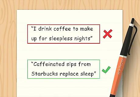 Identify unnecessary words and areas that need revision. Each word in a poem matters, so you only want to include words that add something to the poem. Reading your poem aloud can help you identify words that are clunky and slow down the poem. Cut out words you don’t need, and rephrase clunky language to improve flow. Overall, you want to say as much as you can using as few words as possible. At the same time, you want to be specific. For example, you’d replace the line “I drink coffee to make up for sleepless nights” with “Caffeinated sips from Starbucks replace sleep”