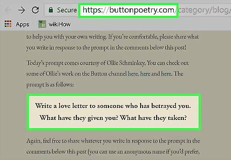 Use a Button Poetry writing prompt. Button Poetry has a section of its website devoted to writing prompts that you can use to get started. Not only can you check out their prompts, but you can read what others have written in response to the prompt if you participate in the Button Poetry community via their website, YouTube, or social media accounts. This is because some poets post their poems or videos of themselves performing them to the community. You can find their writing prompts by visiting here: https://buttonpoetry.com/category/blog/writing-prompts/