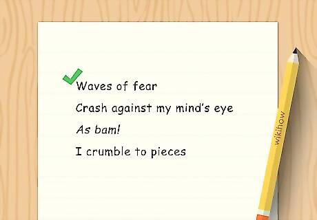 Add emphasis with onomatopoeia. Onomatopoeia includes sound words, like bam, thunk, or crash. Although you might want to use these sparingly, they can enhance your performance. You might use them to draw emphasis or to create a specific feeling in the poem. Play around with them to see how they fit into what you're trying to say. For example, you could use onomatopoeia to add drama to your performance: "Waves of fear/Crash against my mind’s eye/As bam!/I crumble to pieces"