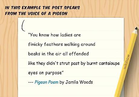 Choose a voice to shape the poem. In performance poetry, voice is where tone and perspective come together. You'll create voice through word choice, rhythm, and attitude. You may want to deliver the poem in your own voice if you're speaking as yourself. However, you may decide to deliver the poem from a different perspective. For example, you might choose to deliver a poem about animal rights from the perspective of a rescue dog.