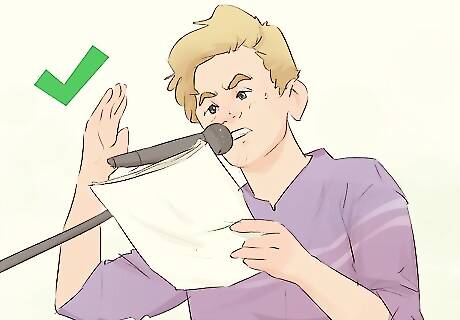 Incorporated gestures and facial expressions into your performance. Performance poetry is in the same arena as theater. Rather than just read your poem, you’ll use your facial expressions and body movements to help convey the message and emotions presented in the poem. Watching yourself practice the poem can help you identify areas where you can incorporate more gesturing or expression.