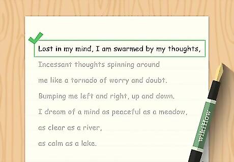 Revise your poem. Read over the poem with a critical eye, cutting out anything that isn’t working. Rewrite clunky or boring phrases, and add more detail in parts that are vague. Finally, proofread your poem to clean up grammar, spelling, and typos. Poems often go through several rounds of revisions before the poet is satisfied with the poem.