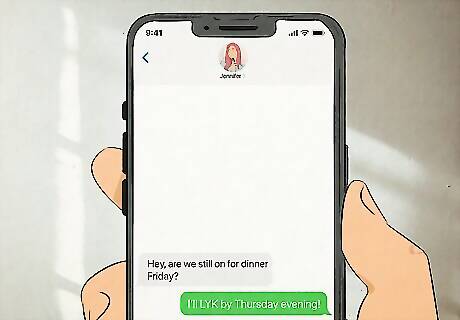 Use LYK when you’re making plans with someone. If you’re trying to make plans but don’t quite know your schedule or if you’ll be free at a certain time, you can tell the other person you’ll “lyk” about availability later. For instance: Them: “Should we meet up for drinks at 7 or 8?”You: “Hmm. Let me check my schedule and I’ll lyk!”