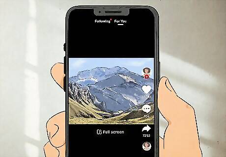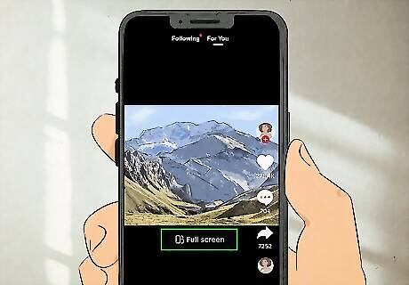 Swipe through TikTok until you see a full-screen video. If you come across a horizontal video in your For You or Following feed, you'll see an icon on the video that says "Full Screen." Horizontal videos are still pretty new, so you may have to swipe for a while before you find one. Horizontal scrolling won't work if you search for a full-screen video! You have to find one by chance in your feed.