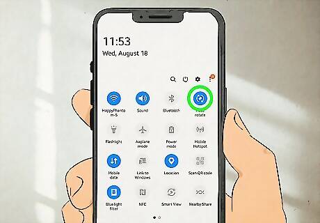 Turn off screen rotation locking. If you want to scroll through TikTok's horizontal videos, you can't have your screen locked in vertical mode. To allow your screen to rotate, you need to turn on auto rotation: Android If you have a Samsung phone, open your Quick Settings and look for the screen orientation icon. If it says Portrait or Landscape, tap it to activate Auto Rotate. On other Androids, open Settings, tap Display & Touch, then enable "Auto-rotate screen." iPhone Swipe down from the upper-right corner to open the Control Center. If the padlock icon surrounded by an arrow is enabled (red), tap it to turn it off (gray).