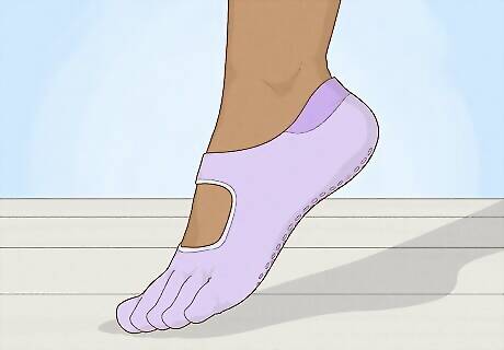Yoga socks Yoga is usually done barefoot, but if you prefer some form of footwear, yoga socks are a good option. They have grippy dots on the heel to help prevent you from slipping. These socks are usually ankle length, and they sometimes have individual toe compartments for improved toe control during complex yoga poses. Some yoga socks are toeless. Wear with: No shoes