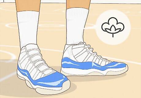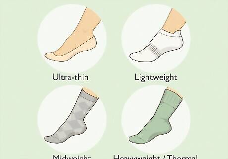 Consider the material and weight of the socks. Even if you need to wear a certain sock to coordinate with your outfit, find one that you’re comfortable in. For instance, if you prefer cozy cotton socks, you might buy cotton dress socks for work and cotton athletic socks to wear with your sneakers. Pay attention to the weather: If it’s cold and raining, you might wear thick, moisture-wicking socks to keep your feet warm and dry.